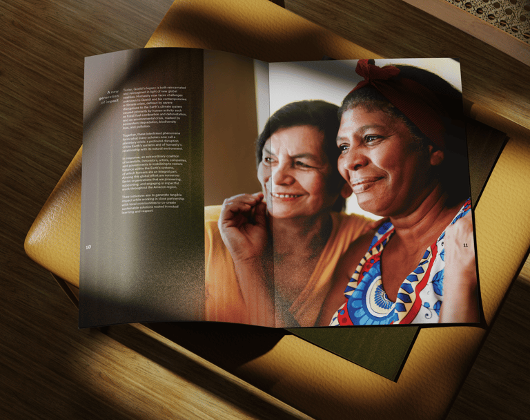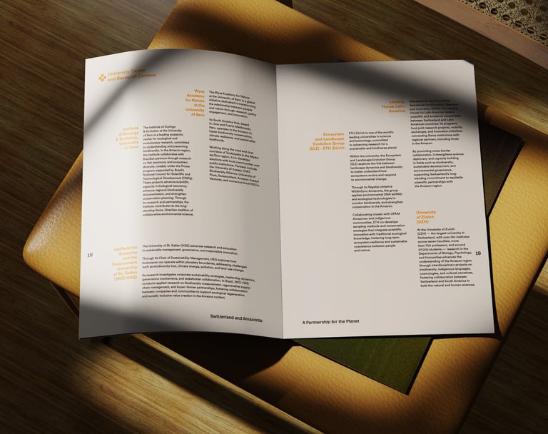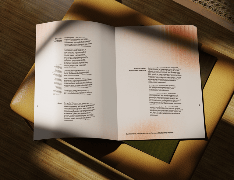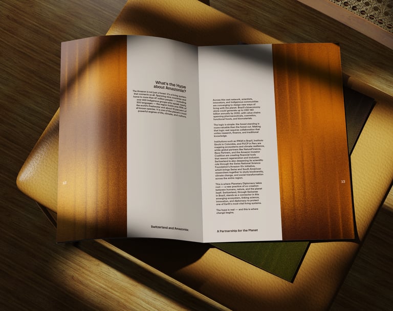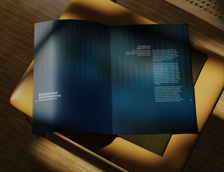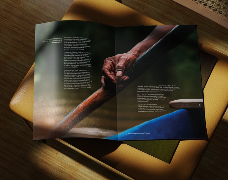 We designed the official report for the Embassy of Switzerland, to be presented at COP30 in Brazil, turning evidence and field stories into a clear, human narrative. A living, refracted gradient echoes the Amazon River to symbolize connection and shared action. Faces, hands, and water anchor the imagery; data sits on calm, breathable layouts. Where science meets community, design becomes the bridge.